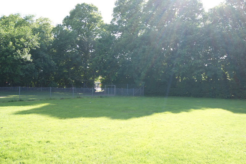 Ovre i hjørnet er der en gennemgang bagom busholdepladsen. Denne plæne er meget velegnet til at lufte hestene.